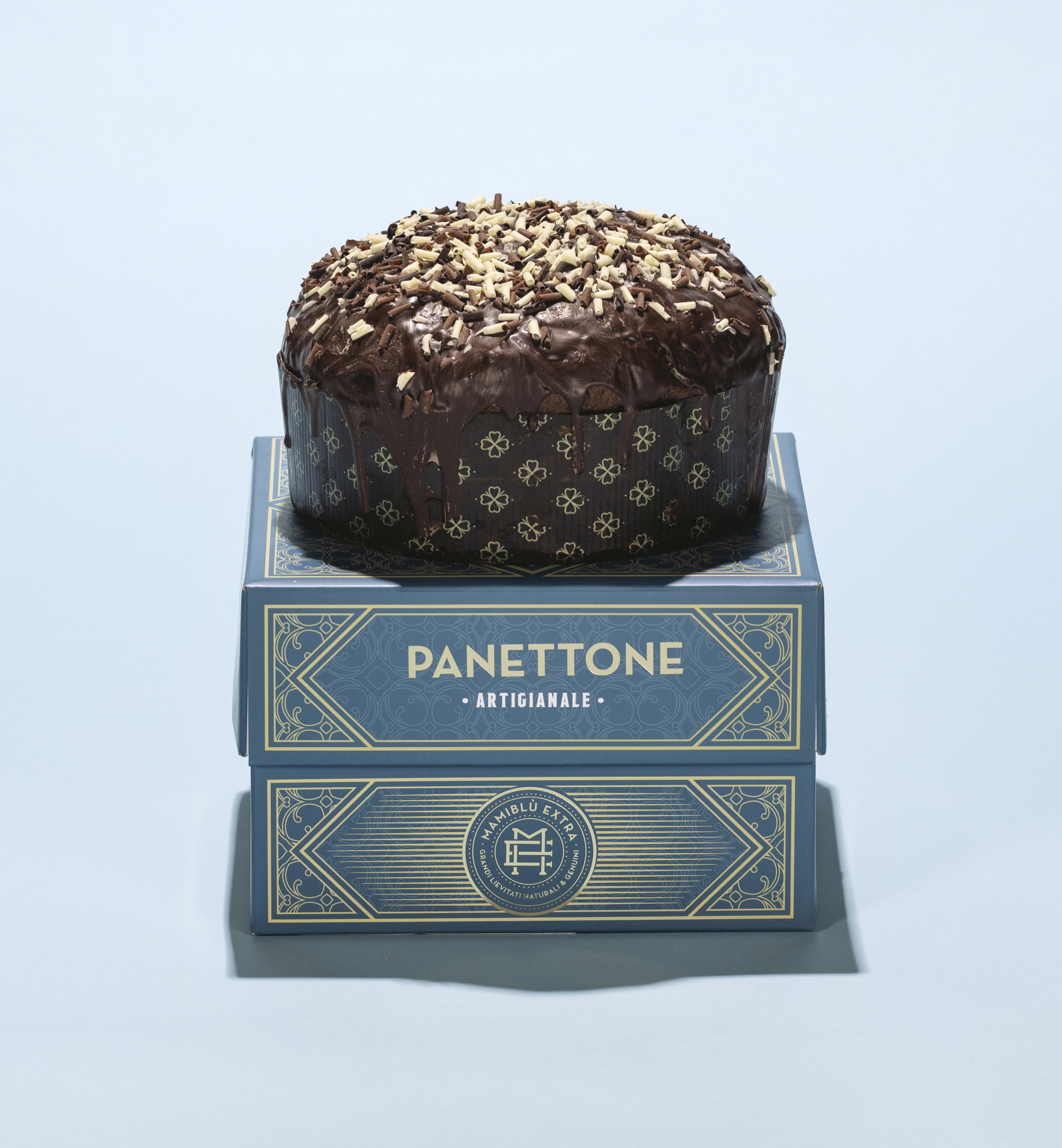 La magia non finisce all’interno: il panettone è ricoperto da una glassa di blend finissimo di cioccolati, resa ancora più golosa da una pioggia di riccioli di cioccolato artigianali che ne esaltano eleganza e irresistibilità.